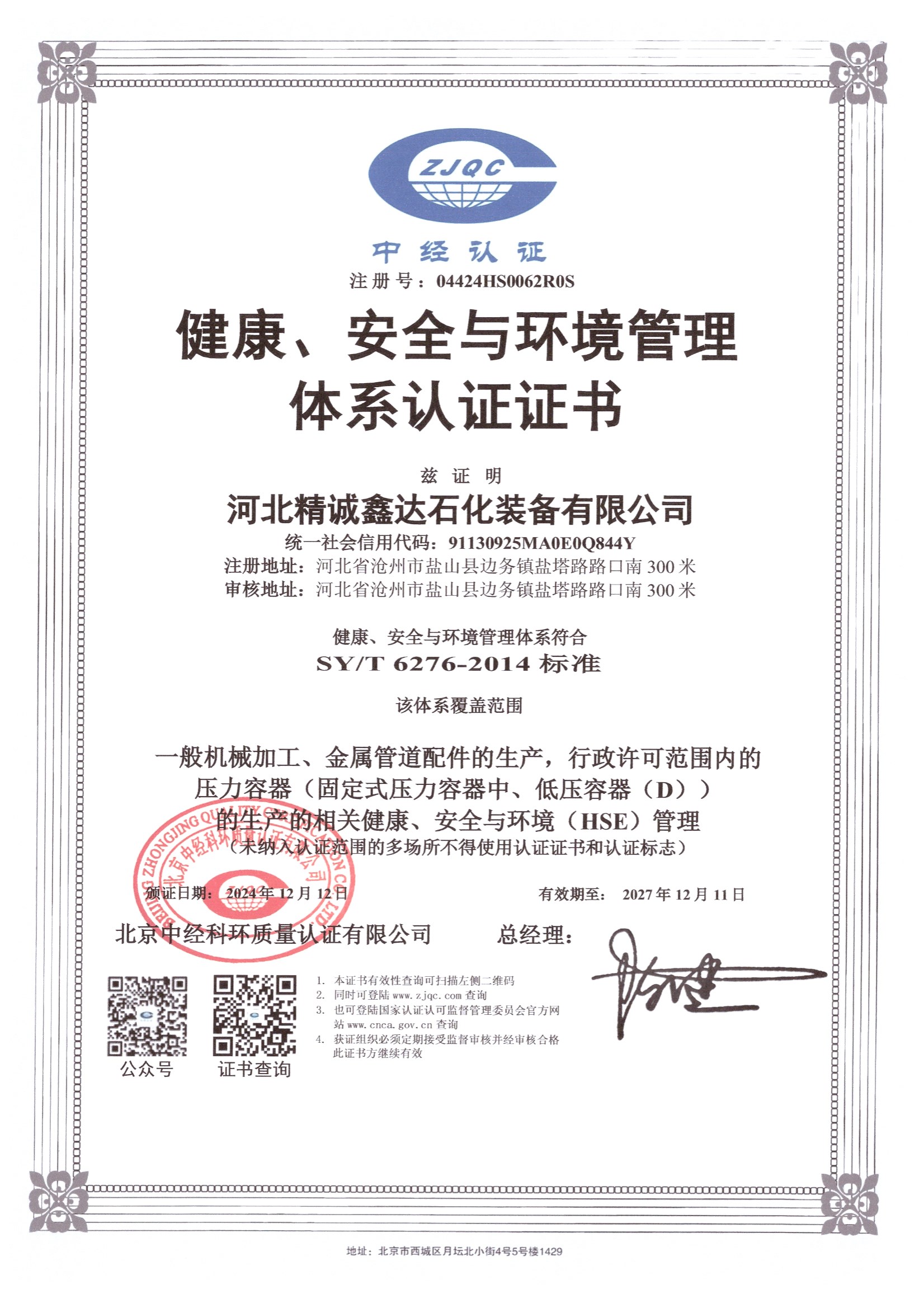 健康、安全环境管理体系认证证书